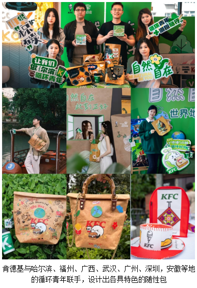 除此之外,在哈尔滨、福州、广西、武汉、广州、深圳、安徽等城市的肯德基餐厅内,也都举行了各具特色的世界地球日活动:来自哈尔滨的自媒体人“小七”现场将废旧衣物与肯德基随行包进行混搭,设计出创意国风单品;广西肯德基餐厅打造出循环青年市集,咖啡香皂、爆改牛皮纸袋和落叶拼贴画等二创产品异彩纷呈;安徽的大学生小佳运用AI技术创造环保画作,循环利用废旧纸张打印;武汉、福州、广州和深圳的循环青年们则以城市特点为创意,将“黄鹤楼+樱花”、“百年上下杭”、“广州塔+木棉花”等运用到肯德基随行包上,让支持环保,成为一种潮流态度……
